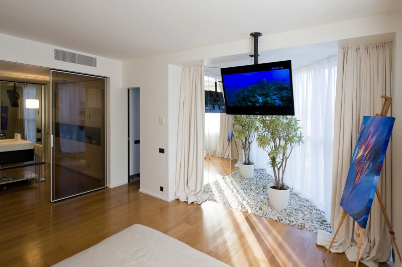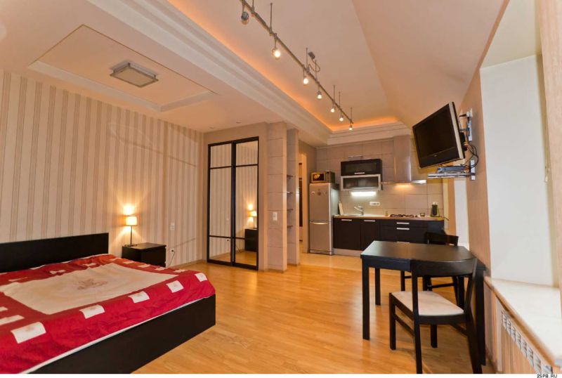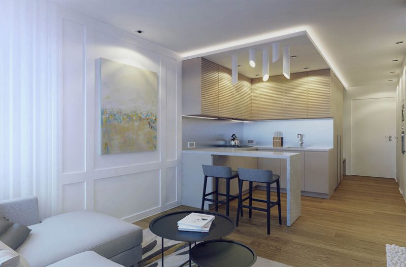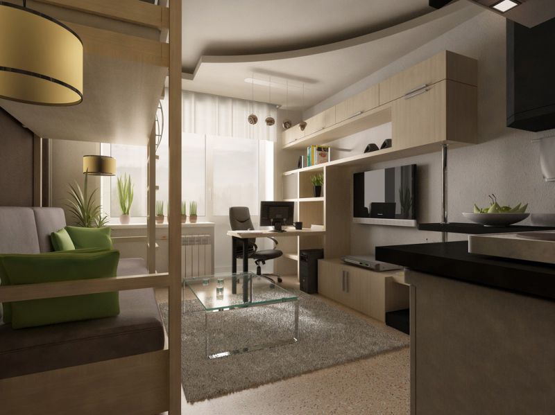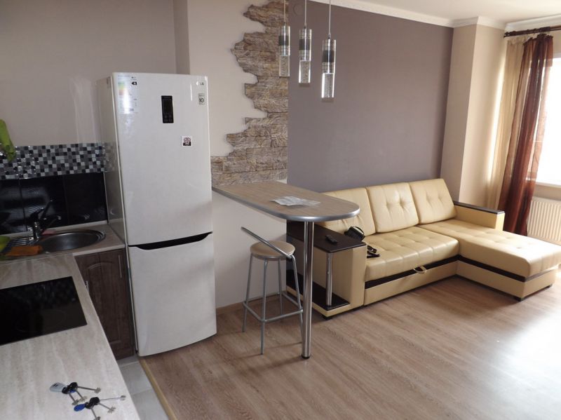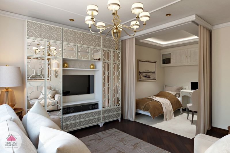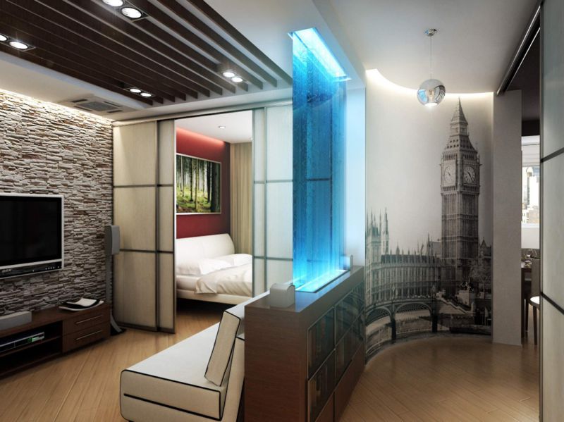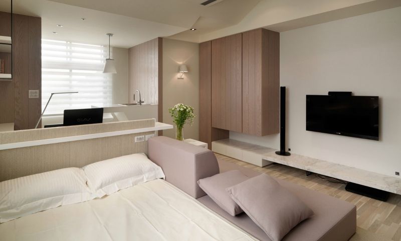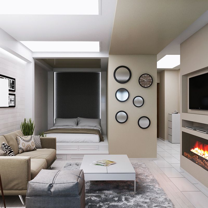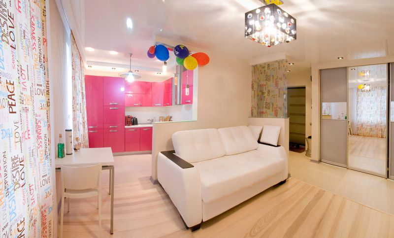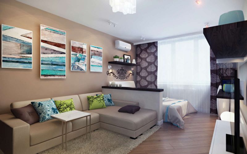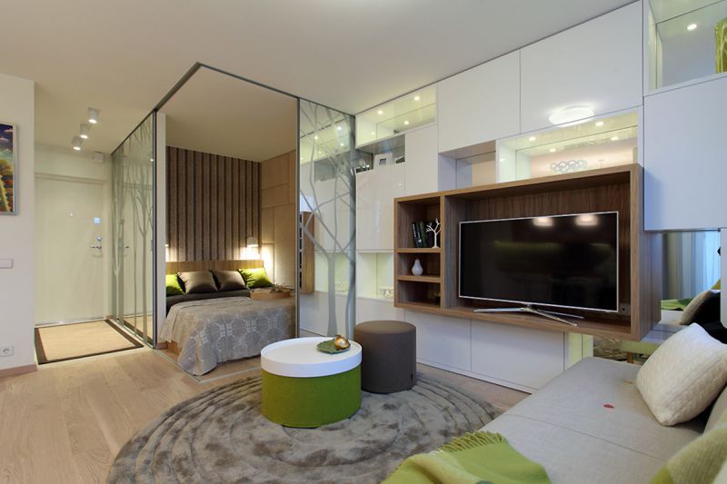 Обычно интересуются фото ремонта однокомнатной квартиры в 35 кв.м. бездетные семьи, люди, проживающие в одиночку. Отличный формат — перепланировка в студию. Разделять стандартную комнату на зоны нет смысла, объединение — способ создать подобие многофункционального министадиона.