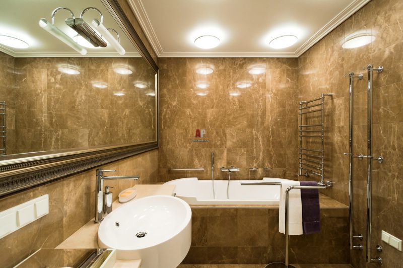 - Акцент на свет: у зеркала, над кабиной, центрированный потолочный светильник. Незабываемую атмосферу создаёт приглушённая подсветка у ванны.