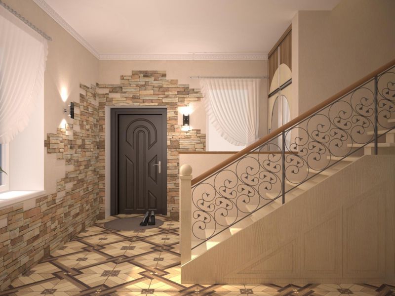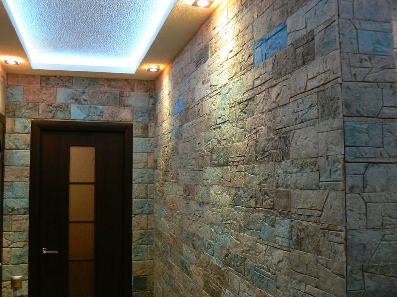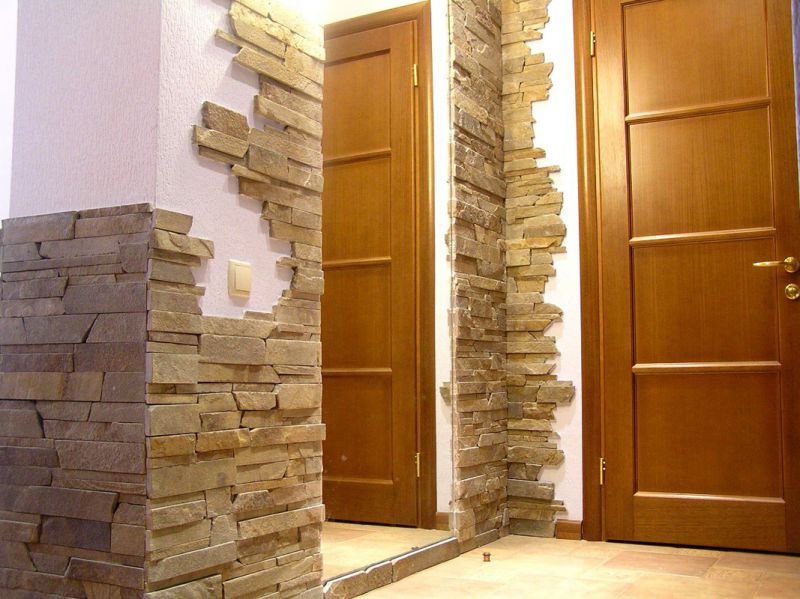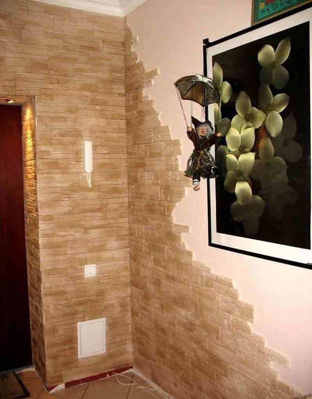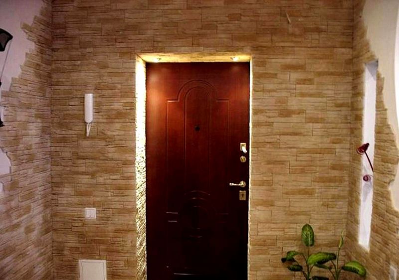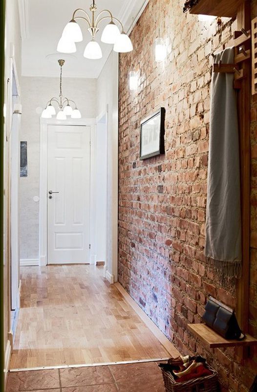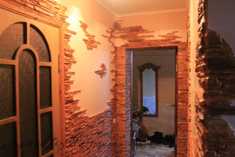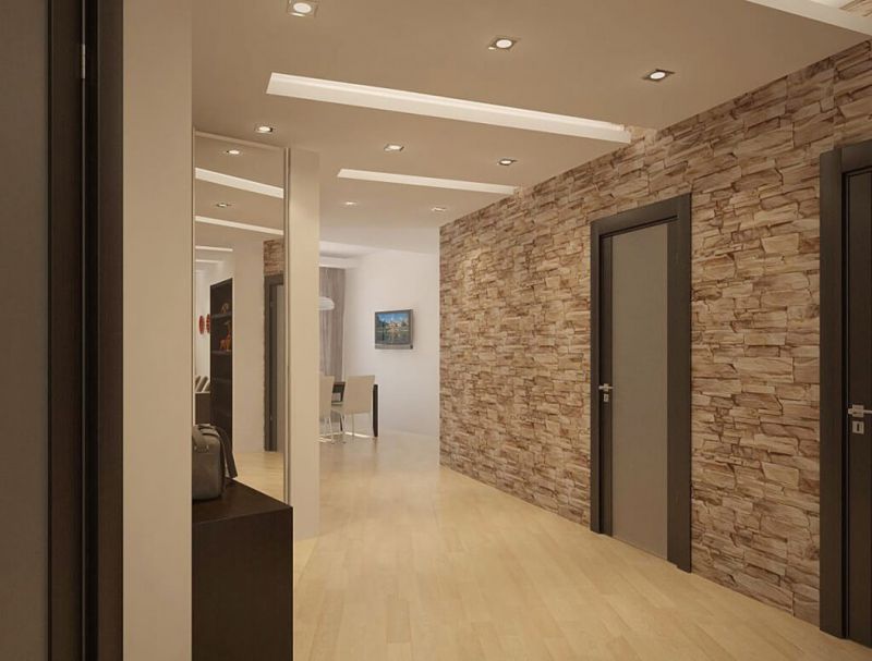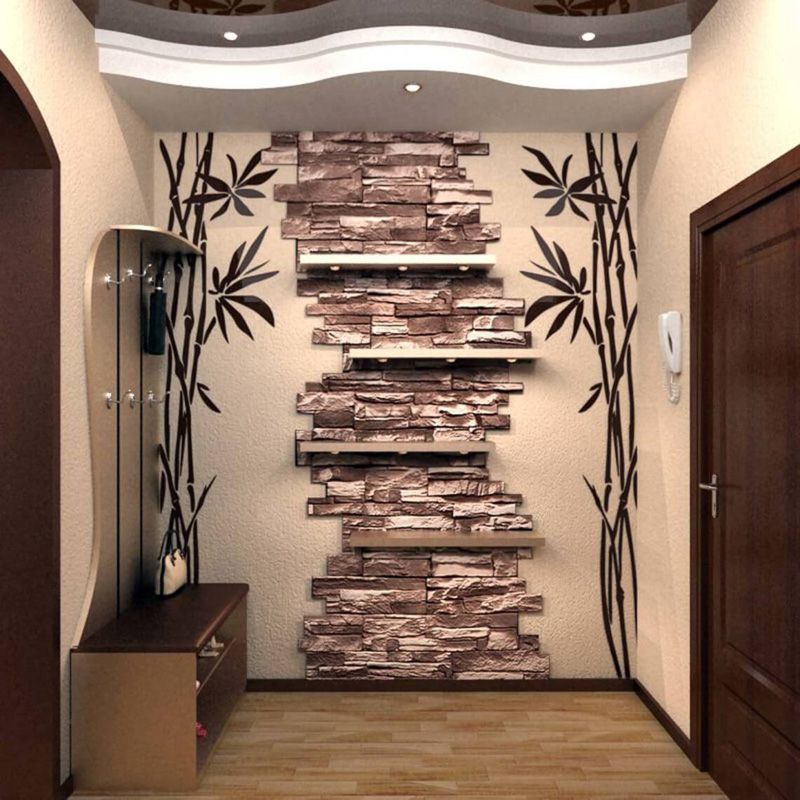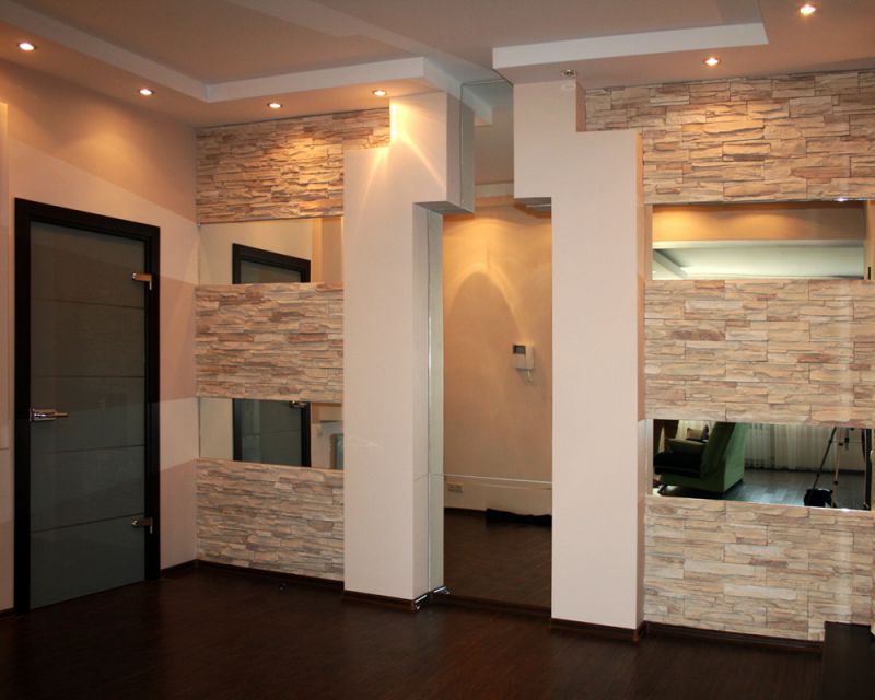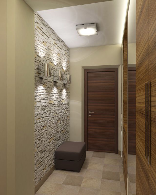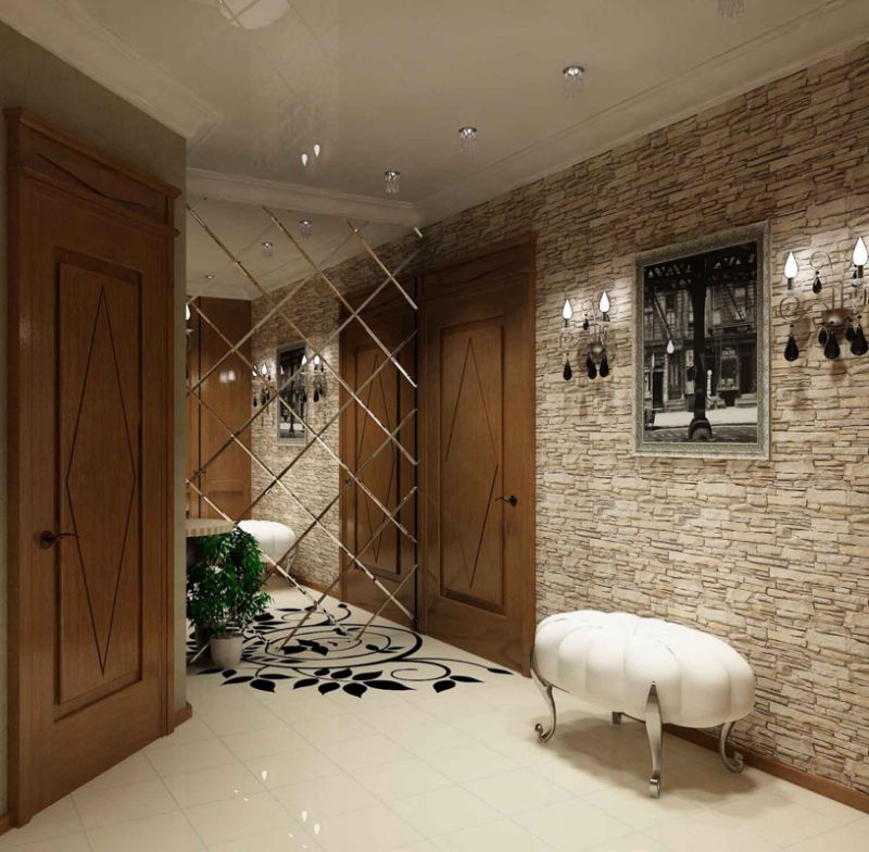 Прихожая отличается от остальных комнат отсутствием окон, узостью, высоким уровнем загрязнения. О дизайне отдельно: некоторые гости дальше неё в квартиру не попадают, соседям интересно заглянуть, а хозяйке нужно часто убираться. Каталог фотографий отделки коридора искусственным камнем и обоями поможет спланировать пространство.