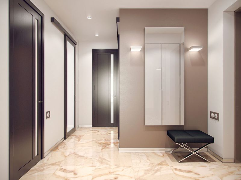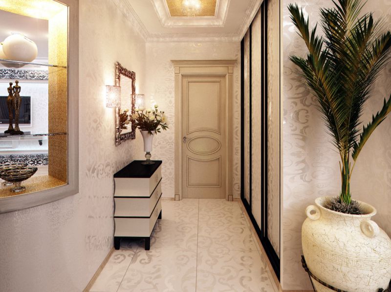 2. Зеркала. При отделке маленького коридора зеркала жизненно необходимы. Самым удачным вариантом станет большое зеркальное полотно на одной из боковых стен. А вот зеркало с массивной рамой разобьет помещение на отдельные фрагменты, зрительно уменьшив его. Также категорически запрещается устанавливать зеркала в конце длинных и узких коридоров.