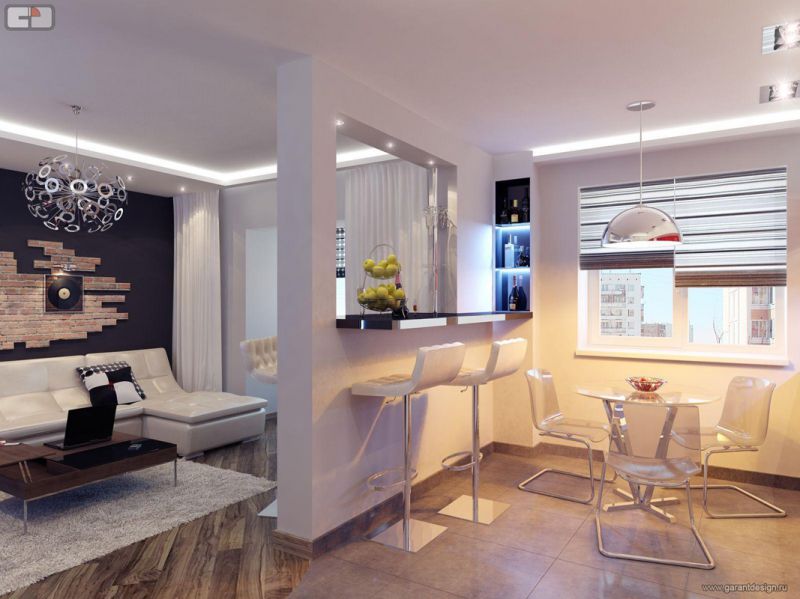 Объединение кухни и гостиной, установка кухонного гарнитура и барной стойки.