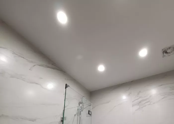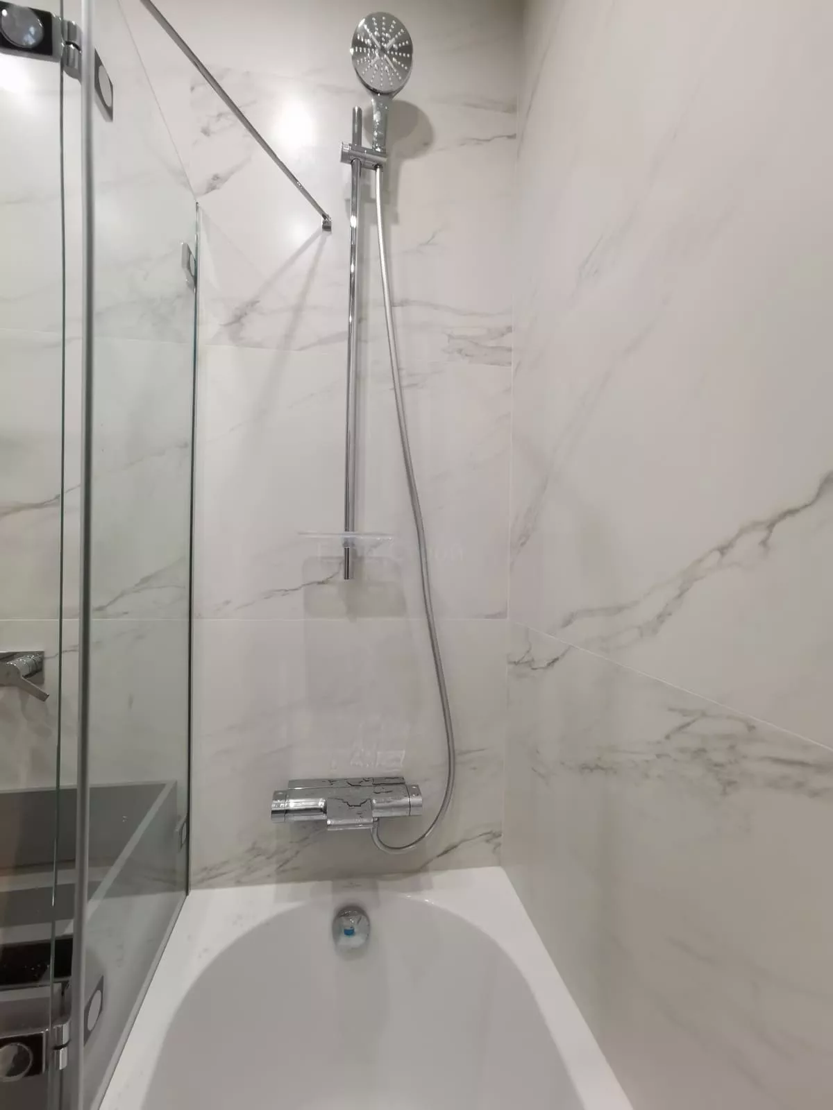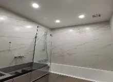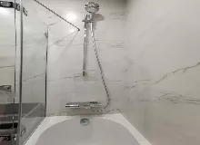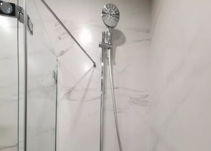 Капитальный ремонт санузла с заменой сантехники, плитки и установкой душевой кабины.