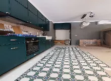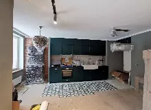 Объединение кухни и гостиной, установка кухонного гарнитура и барной стойки.